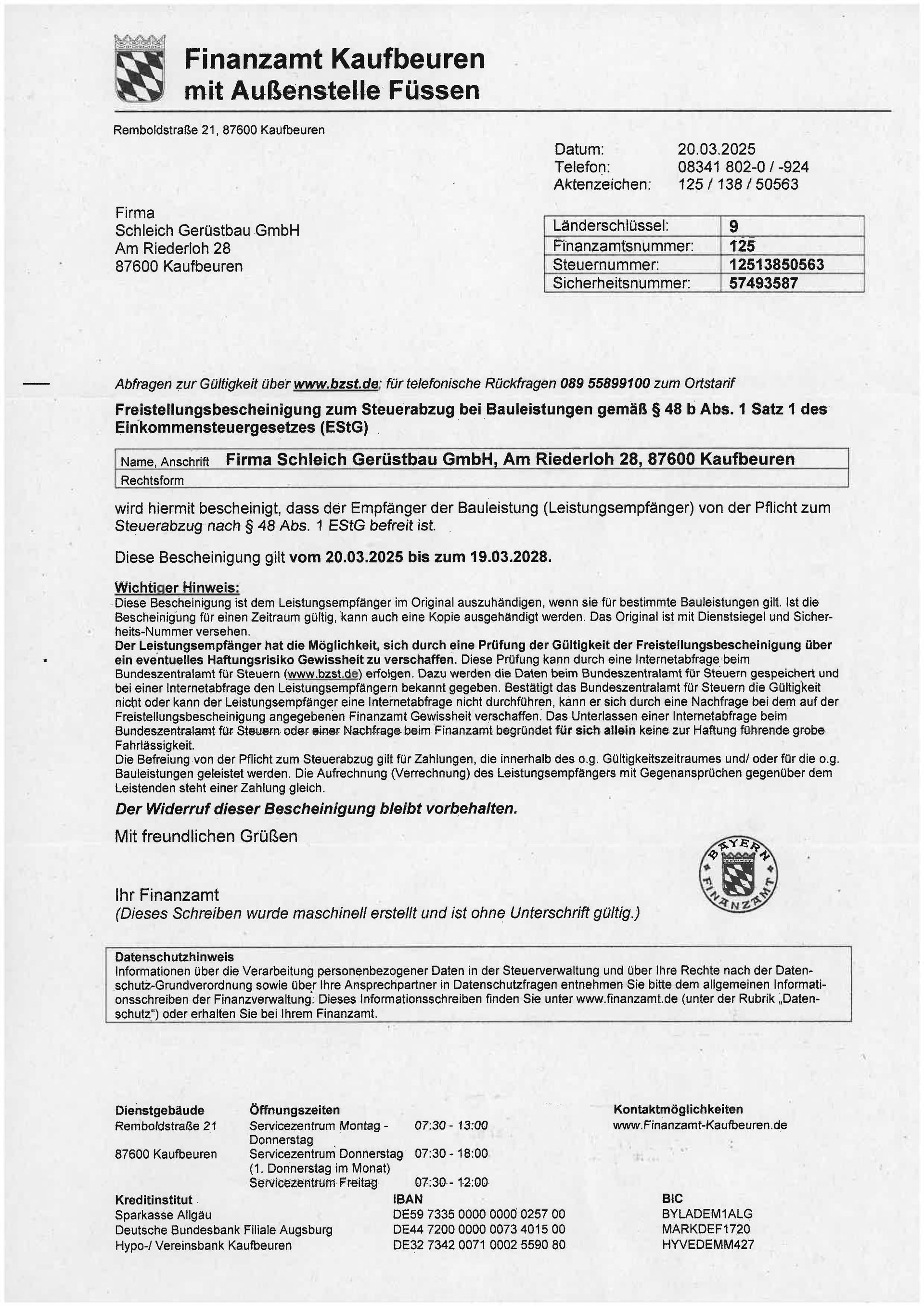 Freistellungsbescheinigung vom 20.03.2025 bis 19.03.2025